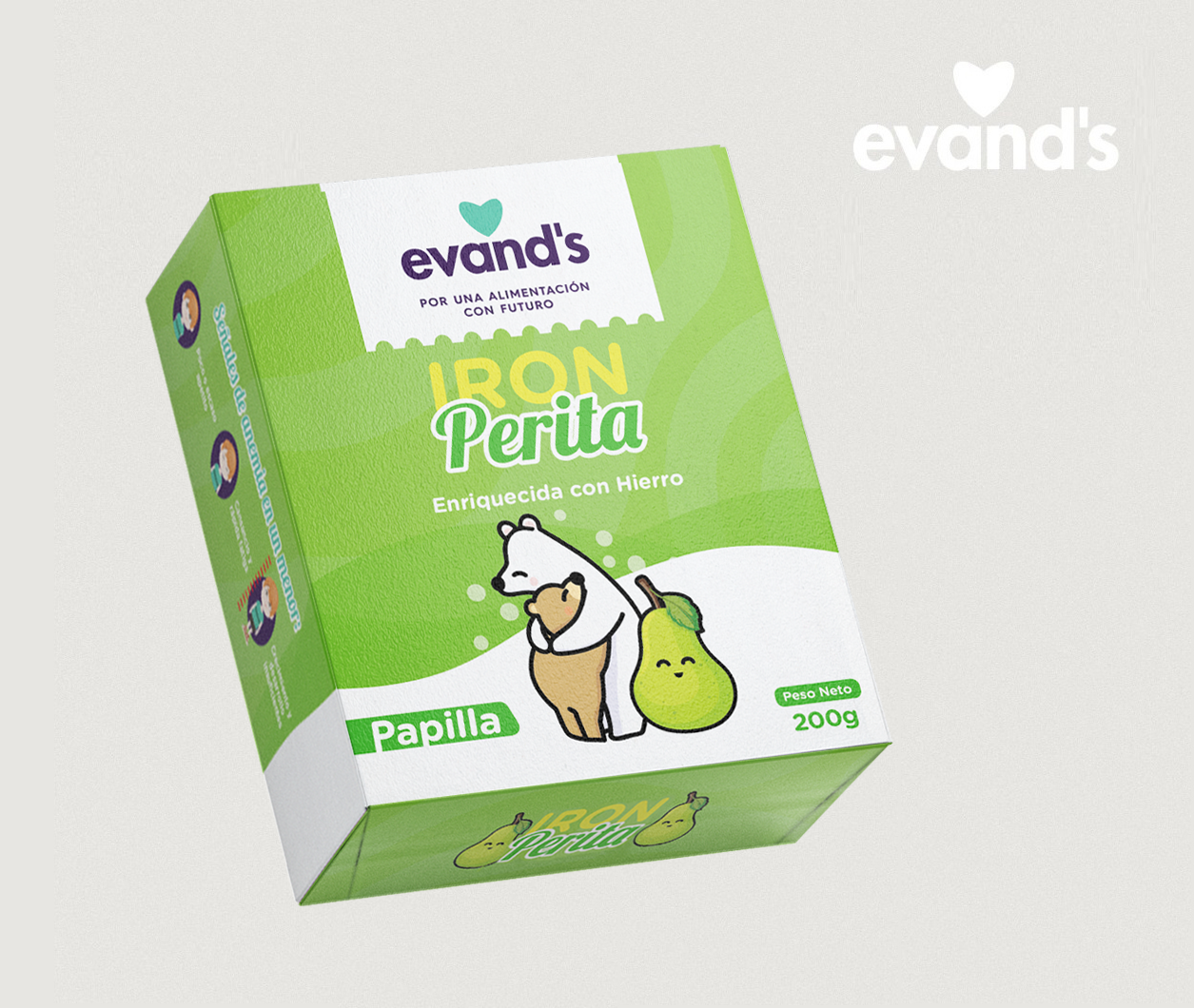 Papilla en polvo a base de harina de pera, fécula de maíz y hemoglobina bovina deshidratada. Cada porción de 20 g contiene 15 mg de hierro y se agrega a la comida del bebé o también se puede hacer hervir con agua y dar de comer al bebé como una mazamorra. Contenido neto: 200 g.