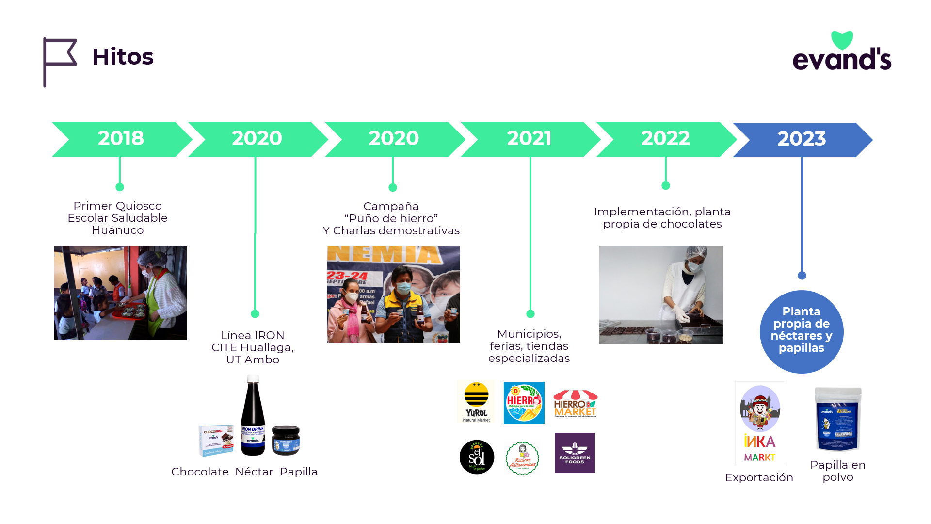 EVAND´S es una empresa de impacto social enfocada en prevenir y combatir la anemia en bebés y niños en edad escolar mediante la elaboración de productos reforzados con hierro (chocolates, néctares y papillas) y mediante las charlas demostrativas gratuitas sobre la importancia del hierro y cómo combatir la anemia desde casa empleando insumos de su región y que son dirigidas a padres de familia.