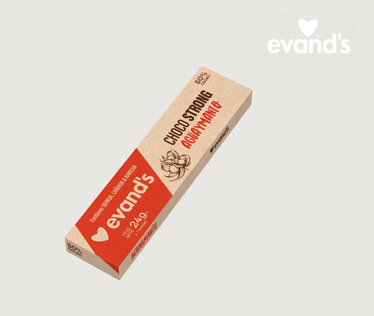 Chocolate a base de cacao con cañihua, inclusiones de semillas, frutos secos y reforzada con hemoglobina bovina. Contiene 10.2 mg de hierro y tiene 6 presentaciones: con inclusiones de aguaymanto, coco, semillas de calabaza, semillas de girasol, maní y pasas, para brindar vitaminas para los niños. Contenido neto: 20g.
