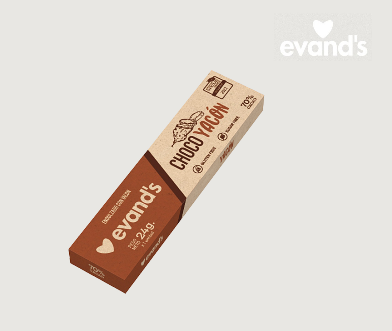 Apto para celíacos y diabéticos, ayuda a regular el azúcar en la sangre. Chocolate al 70% de cacao endulzado con polvo de yacón. Contenido neto: 24 g.