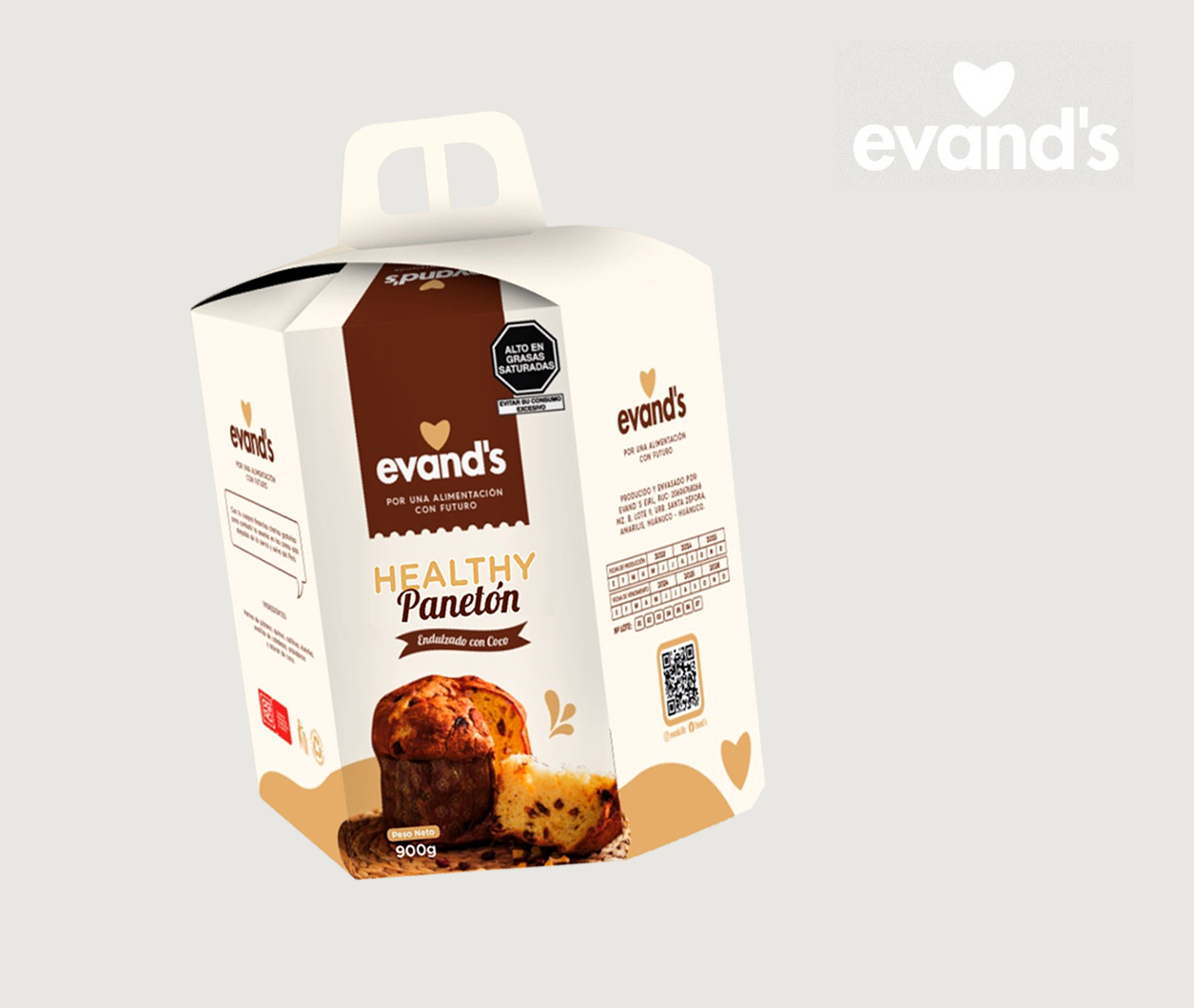 Panetón saludable a base de harina de plátano, quinua, cañihua, kiwicha y relleno con semillas de calabaza y frutos secos, está endulzado con panela. Contenido neto: 900 g.